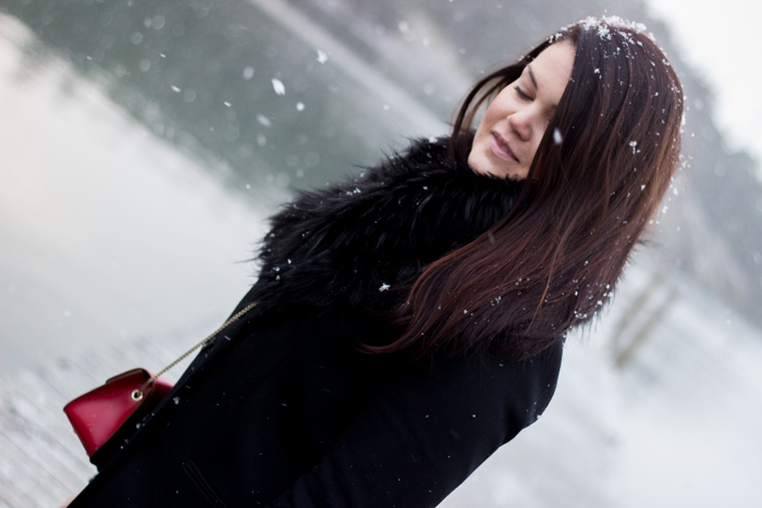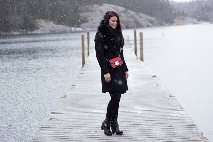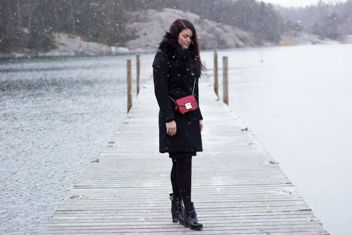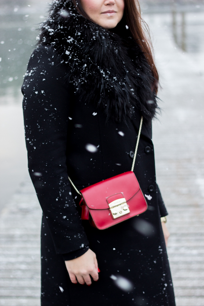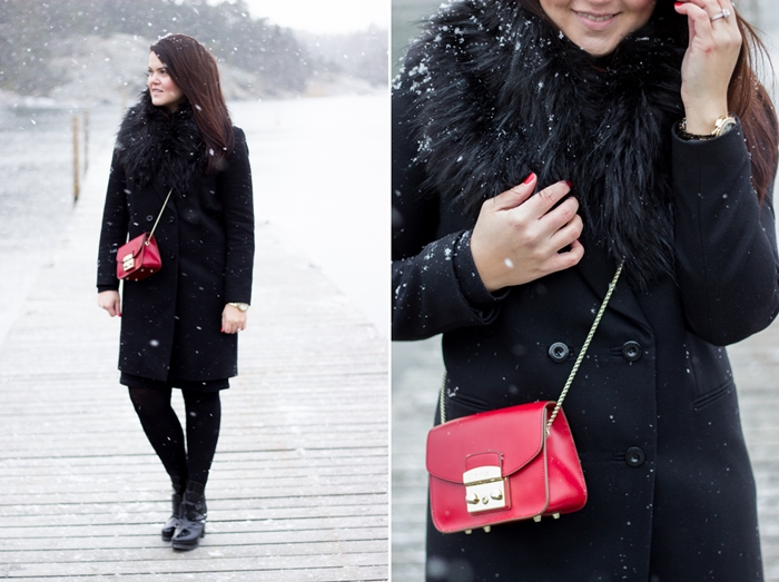 Musta-punainen on tavallaan ilmiselvä yhdistelmä, mutta mulle kaikkein vierain. Jotakin puna-mustassa on sellaista, joka on mulle lähtökohtaisesti nou nou, mutta halusin testata asiaa. Mustaan vähän eri pintoja kiiltonahalla ja karvalla, sekä kengät että kaulus rouheampia ja isompia kappaleita kuin tuo pikkuruiden laukku - ja hei täähän oli ihan ookoo!
